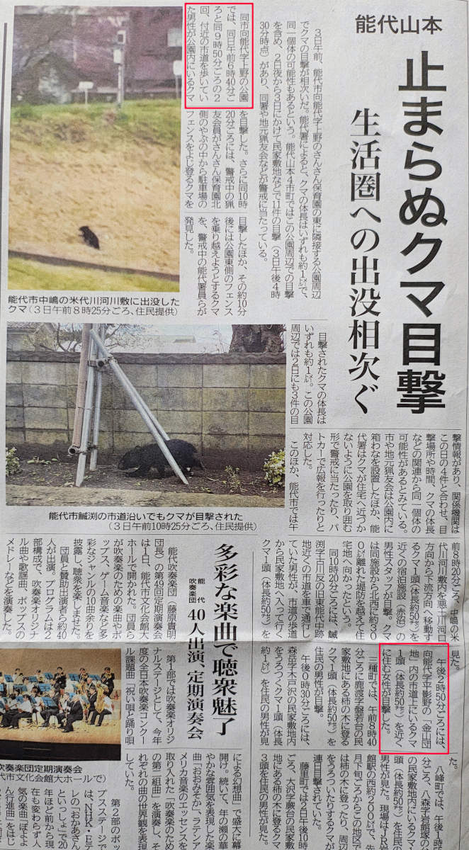 熊出没に関して北羽新報の記事ですが、その中で「向能代上野」「平影野・金山団地」での目撃情報があります。この地域、及び落合地区では毎日の様に熊の目撃情報があります。日によって熊の大きさが違うので、複数頭が居るのかも知れません。ただ、見る角度や距離・熊の体勢等によって感じる大きさが変わるので、同一個体かもしれません。いずれにしろ、住宅地に住み着いた熊の様に感じられる。もし住み着いたならば、生ゴミの出し方も従来の方法では熊にエサを与えている事と同じです。果たして何らかの対策をしているのかは分かりませんが、エサがある内は冬眠をしないで住み着く事になります。