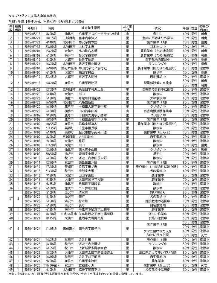 表は2025.05.18から10.28現在までの状況ですが、人的被害は49件あり56名の方が何らかの傷を負っている。そして、3名の方は命を失った。驚く事は、2名は山中での遭遇ですが残りの方は人里で被害に遭っている。 (10月28日以降、11月3日に熊に襲われた一人の遺体が発見された。そして、ケガ人は増え続けています。)