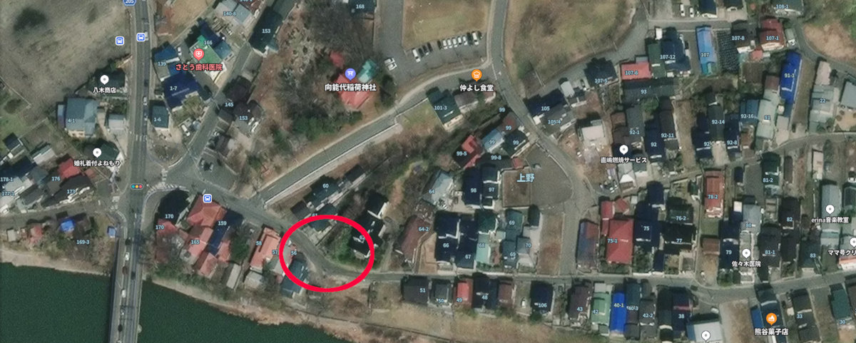 場所は「東雲羊羹・熊谷長栄堂」の辺り。向能代 旧市街地で住宅の多い場所。