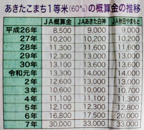 新聞に「あきたこまち一等米(60kg)の概算金推移」が載っていました。左側の「JA概算金」というのは、「JA全農あきた」で決められた額だと思います。秋田県のJAは、管内の群市町村によって13のJAがあります。それらをまとめているのがJA全農あきただと思うのですが、たぶん各JAの独立採算で運営されているのではないだろうか? 以前 各JAの間で全農主導で合併の話があった様な気がしましが、何か実現しなかったと記憶している様な・・・? いずれにしても各JAが独立採算で運営されているならば、JA全農あきたは必要が無いのでは? と自分は思う。組織が複雑になれば、それだけ流通が複雑になります。それが、米価にも影響が出てくると思う。