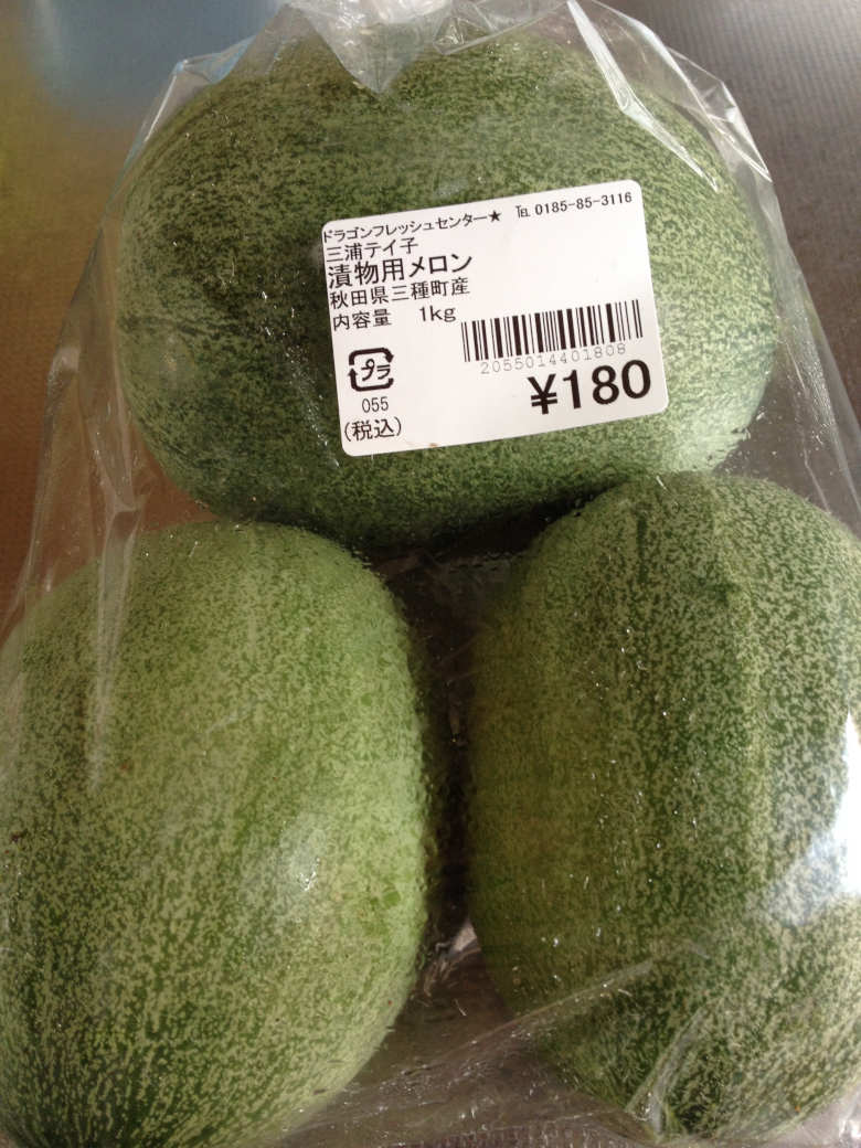 摘果とは、実を大きく美味しくするために間引きをする事で、摘果された物は未熟で食べる事が出来ず通常は廃棄されている。その摘果されてメロンで漬物を作るという記事が新聞に載っていた。 メロンの漬物の存在は前から知っていたが、食べた事がなく不気味にも感じていた。食べず嫌いという事だろう。新聞にレシピが載っていたので、自分で一度作ってみようか! と思い買物に来た。 一袋に1kg詰で、180円(税込)であった。品種は確かでないが、タカミメロンではないかと思われる。